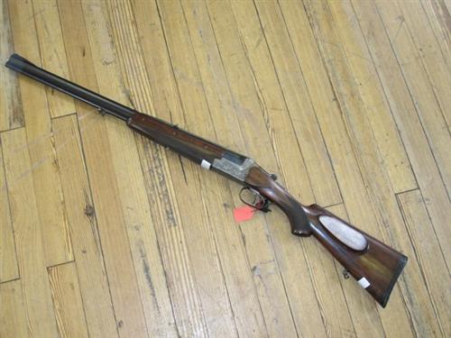 25in. nitro chopperlump barrels with matt sight rib, open sights and folding leaf sights for 100, 200 and 300 yards, ramp-mounted bead foresight, concave rib engraved 'J. PURDEY & SONS, AUDLEY HOUSE, SOUTH AUDLEY STREET, LONDON, ENGLAND.', the breech end mounted with a Swarovski Habicht 4 telescopic sight in quickly-detachable mounts, bolstered treble-grip action with side-clips, removable striker discs, bolted automatic safety with gold-inlaid 'SAFE' and 'BOLTED' details, cocking-indicators, best fine bouquet and scroll engraving, retaining much original colour-hardening and finish, 14 5/8in. highly-figured pistolgrip stock with cheekpiece, finely engraved steel pistolgrip-cap, sling swivels, weight 9lb. 7oz., in a brass-cornered oak and leather case with some accessories. We are kindly informed by the makers that this rifle was completed November 1937 for H.H. The Maharaja of Patiala.