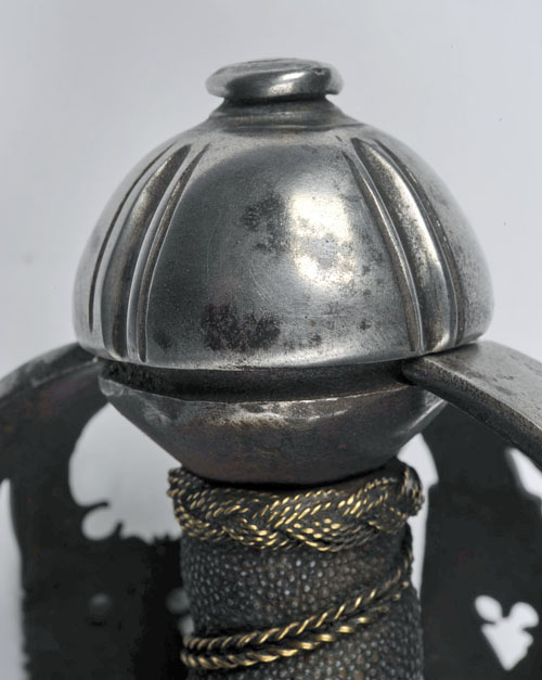first half of the 18th century, possibly for issue to an English Horseman, with 33in double-edged blade, two short, narrow fullers at the ricasso flanking a wide central fuller running for one third of the blade length, terminating in a blade makers mark of two intertwined 'C's', complex steel basket with panels featuring typical pierced decoration, wire bound sharkskin grip (a later sympathetic replacement) and bun-shaped pommel (some discolouration to hilt, blade cleaned and polished)
