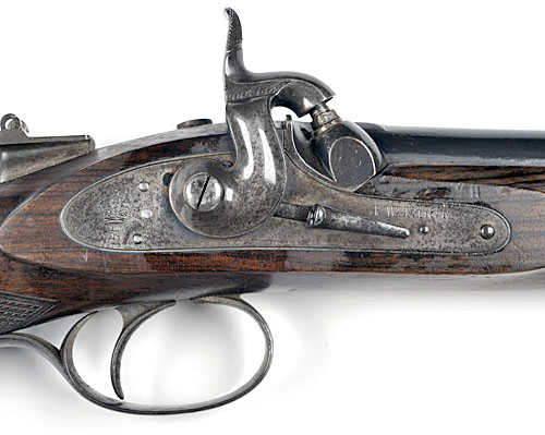 circa 1865, with re-blued, round 36in sighted barrel, adjustable bead foresight with dovetail for tunnel (missing), micro adjustable elevating ladder rearsight and provision for vernier tang sight (missing), the breech end signed 'J W EDGE MANCHESTER' and 'EDGE'S PATENT No 76', underside of barrel marked 'FAULKNER' together with the serial number, military style border lined lock signed ' J.W. EDGE' together with a crown over the letter 'E', sliding safety forward of the hammer, figured walnut half-stock, fully chequered at the wrist and forend, steel heel plate, blued steel 'pistol grip' trigger guard and shaped horn forend tip, no provision for ramrod, good traces of original colour remaining on furniture.
