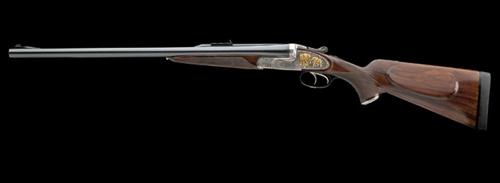 24 1/4in. Bohler Rasant steel nitro chopperlump barrels, sight rib gold-inlaid 'CUSTOM MADE BY - J FANZOJ. FERLACH' and with border engraving, open sights and three folding leaf sights with gold-inlaid sighting lines, sunken matt rib, matted ramp-mounted bead fore-sight with flip-up moonsight, treble-grip action with side-bolsters, removable striker discs, toplever pierced with the head of a snarling lioness, elongated top strap with manual safety, gold-washed cocking-indicators, articulated front trigger, the action, lockplates and furniture engraved with fine stylised acanthus scrollwork with gold-inlaid highlights, the left lockplate carved in high relief and gold-inlaid with a pair of African elephant, the right with two buffalo, the underside with a leopard with its kill, the triggerguard carved and gold-inlaid with a monogram 'E.W.', 15in. figured pistolgrip stock with cheekpiece, engraved steel pistolgrip-cap with trap gold-inlaid with the head of a wild dog, 1in. rubber recoil pad, weight 11lb. 11oz.