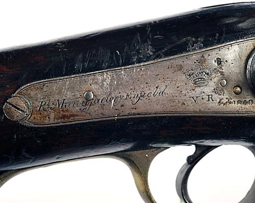dated for 1840 with 32 5/8in. two-groove rifled barrel with no provision for bayonet, applied blade fore-sight, dove-tail provision for rear-sight (missing), borderline engraved back-action lock marked with 'VR' cypher, dated '1840' and signed 'RL. MANUFACTORY ENFIELD, walnut full stock (heavily bruised, loss to front right hand side top edge of fore-end), the side of butt stamped with an Enfield W/O mark and dated 1861, also stamped '195' over '1.C.R', heavy brass furniture including hinged patch-box cover, provision for ramrod (missing) and Ordnance inspection marks.