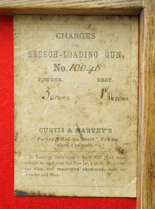 suitable for 30in. barrels, relined with red baize, brass lock (key missing), the lid interior with a 'J PURDEY ' trade label, together with a 'CHARGES' label for serial no. 10048, the lid exterior with a brass escutcheon and the monogram 'F.L.'