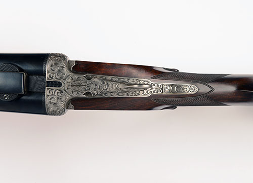 26 15/16in. nitro barrels with matt sight rib gold-inlaid '470 N-E', open sights with one folding leaf sight, ramp-mounted bead fore-sight with fold-over moonsight, mounted with a Docter red-dot sight mounted on a plate to fit quickly-detachable claw mount bases, left barrel gold-inlaid 'Ernest Dumoulin Herstal Manufacture d'armes de Luxe', treble-grip action with side-bolsters, removable striker discs, manual safety with gold-inlaid 'SAFE' detail, articulated front trigger, action and furniture deeply carved in relief with scrolling acanthus motifs on a matt background, the lockplates finely engraved with scenes of buffalo and rhino, the underside with a charging bull elephant, the triggerplate signed 'V. Grojean', bright finish, 15in. well-figured pistolgrip stock with cheekpiece, engraved steel pistolgrip-cap, sling eyes and including 1in. rubber recoil pad, beavertail fore-end, weight 11lb. 2oz.