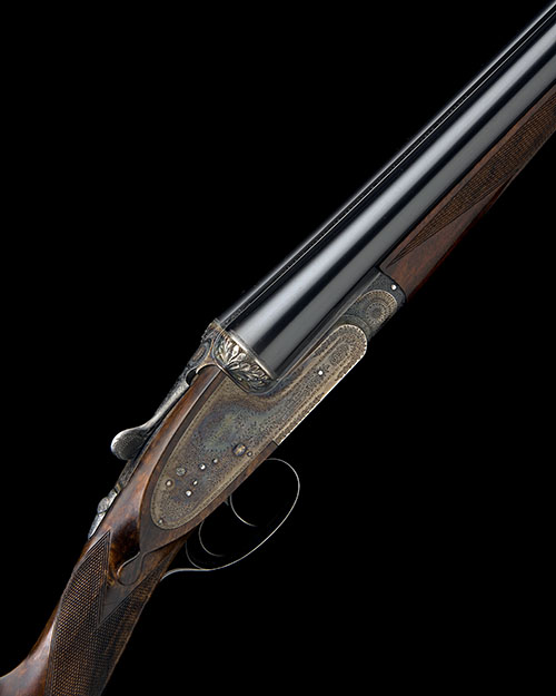 28in. nitro chopperlump barrels, rib engraved 'FREDERICK BEESLEY (FORMERLY OF ST. JAMES'S ST., LONDON.) AMERSHAM', 2 3/4in. chambers, bored approx. imp. cyl. and 1/4 choke, fences carved in high relief with oak leaves and acorns, automatic safety with gold-inlaid 'SAFE' detail, gold-inlaid cocking-indicators, Holland & Holland type self-opening system, fine bouquet and scroll engraving, the makers name in flowing banners, retaining much original colour-hardening and finish, 15 3/4in. very highly-figured cast on stock including 1in. leather covered recoil pad, weight 6lb. 15oz., in its brass-cornered leather case with gold-tooled label and spare beavertail fore-end wood