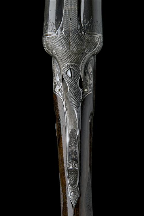 27 1/2in. (70cm) nitro reproved 'Prima' Krupp-steel barrels (in 2018, finish struck off and touched in, light bulge left tube), file cut top-rib with banner engraved in gothic script 'Franz Karl, Luneburg', flip-up open sights and bead fore-sight, 2 1/2in. shot chambers, bored approx. 1/4 and 3/4 choke, scroll-back action with carved serpentine fences, action incorporating Franz Karl patent hinged breech face and rib extension barrel lock-up, patent 185641 of 7th May 1907, hold-open toplever, pin cocking-indicators, tang mounted barrel selector slide, manual side safety, set front trigger, bold foliate designs carved onto a matted background, with small game scenes of fox and duck and roe deer, triggerguard engraved with a red stag and with horn bolster, 14 1/4in. figured pistolgrip stock with cheekpiece, fluted horn pistolgrip-stock, sling swivels, engraved sprung steel ball ammunition trap, horn buttplate with FN trademark, fore-end with Deeley & Edge patent release, weight 7lb. 2oz.
