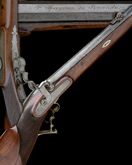 German, circa 1860, with tapering octagonal 33 1/2in. barrel, false muzzle, dove-tailed blade fore-sight, elevating rear-sight, the top flat near breech signed 'P SPAMANN IN RAVENSBURG', plain breech with scrolled snail, plain bar-action lock with slab-sided hammer, walnut full-stock chequered at the wrist, raised cheek-piece, heavy white-metal crescent heel-plate, elongated trigger-guard bow with finger-notches, double set-triggers, white-metal mounts, horn fore-end tip and wood ramrod