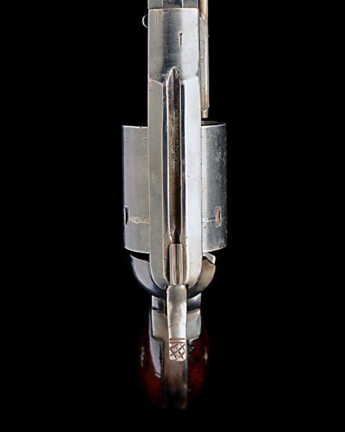 circa 1873, with blued 8in. octagonal barrel (address obscured), pillar blade fore-sight, sighting groove to the top-strap with modified rear-sight notch, plain blued cylinder, plain blued frame, brass trigger-guard and two-piece walnut grips with traces of a martial cartouche on the left, the whole being and older refinish
