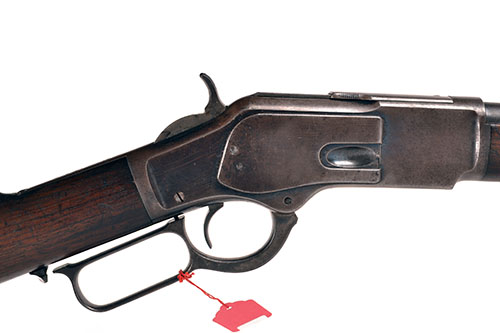 for 1897, with round 20 1/4in. barrel signed 'WINCHESTER'S REPEATING ARMS NEW HAVEN CT. KINGS IMPROVEMENT PATENTED MARCH 29 1866 OCTOBER 16 1860', block and blade fore-sight, elevating ladder 'carbine' rear-sight, plain receiver with sliding dust-cover and side-mounted saddle-ring, top-tang marked 'MODEL 1873', walnut straight-hand butt-stock with iron 'carbine' heel-plate fitted with sliding central trap-door, brass cartridge-lifter with calibre designation, plain walnut fore-end with single iron barrel-band under-barrel full-length magazine the whole with strong traces of finish