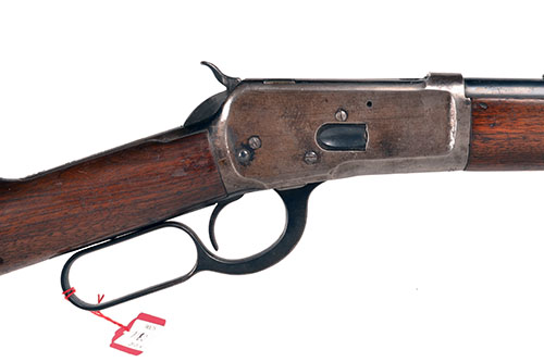 for 1922, with round 24 1/4in. blued barrel marked 'MANUFACTURED BY THE WINCHESTER REPEATING ARMS CO. NEW HAVEN, CONN, USA PATENTED OCTOBER 14 1884', dove-tailed blade fore-sight, buckhorn rear-sight, plain receiver, the top-tang marked 'MODEL 92 WINCHESTER TRADE MARK REG US PAT OFF & FGN', walnut straight-hand butt-stock with iron crescent heel-plate, plain walnut fore-end with iron nose-cap and full-length under-barrel magazine, the whole retaining a good proportion of original finish.