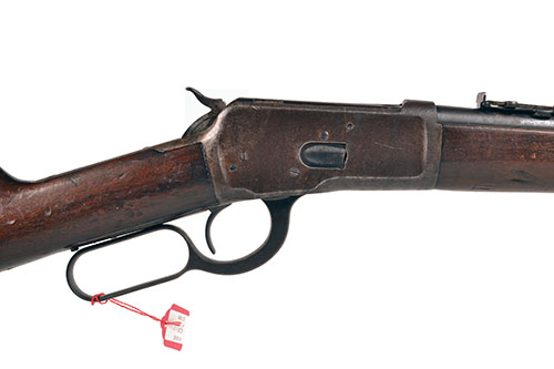 for 1919, with special short 14in. tapering barrel, the side marked 'MANUFACTURED BY THE WINCHESTER REPEATING ARMS CO, CONN USA. PATENTED OCTOBER 14 1884', block and blade fore-sight, elevating ladder rear-sight, plain receiver with saddle-ring to left hand side, top-tang marked 'MODEL 92 WINCHESTER TRADE MARK REG US PAT OFF & FGN', walnut straight-hand butt-stock with iron 'carbine' heel-plate, special short walnut fore-end with iron barrel-band, full-length under-barrel magazine and further barrel-band at muzzle, traces of original finish throughout
