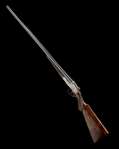 28in. nitro chopperlump barrels, ribs engraved in script 'MODEL DE LUXE' and with '1' and '2' gold-inlaid in ovals set in deeply engraved foliate designs, the tubes engraved 'HOLLAND & HOLLAND. BRUTON STREET. LONDON.', 2 3/4in. chambers, bored approx. 1/4 and 1/2 choke, Holland & Holland self-opening actions, toplevers gold-inlaid '1' and '2', automatic safeties with gold-inlaid 'SAFE' details, Holland & Holland patent hand-detachable lockplates, gold-inlaid cocking-indicators, rolled-edge triggerguards, the actions, lockplates and furniture deeply carved with flowing stylised foliferous motifs on a finely matted background, the undersides with circular vignettes surmounted with 'HOLLAND & HOLLAND' and depicting finely engraved portraits of retrievers, the triggerplates signed 'G.L. CLARK', bright finish, 15 1/4in. highly-figured Prince of Wales semi-pistolgrip stocks with elliptical pistolgrip caps, weight 6lb. 11oz., in their lightweight leather case with accessories and canvas outer