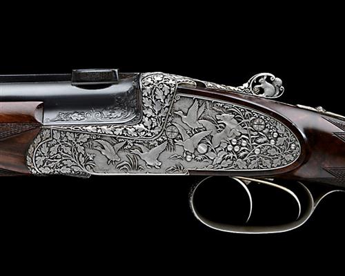23 5/8in. (60cm) Bohler Rasant-steel nitro barrels with stepped raised matt top-rib, folding open sights and ramped bead fore-sight, the breech end mounted with a Zeiss Diavari-Z 1,5...6x42 T* telescopic sight in quickly-detachable mounts, engraved with oak leaf and acorn motifs, quadruple-grip action with side bolsters exquisitely carved in high relief with oak leaves and acorns on a matt background, toplever carved en suite and pierced with a squirrel with a pine cone, automatic safety, cocking-indicators, set front trigger, the action, lockplates and furniture finely engraved with further oak leaves and acorns, framing finely carved three-dimensional game scenes, on the left a fox lunging at a raft of ducks, on the right feuding Blackcock and a covey of Greyhen, the underside with a tok of capercaillies, the triggerguard finely carved with a monogram and hive, old silver finish, 14in. exhibition grade pistolgrip stock with sculpted cheekpiece, sling swivels, horn pistolgrip-cap and buttplate, weight 7lb. 6oz.