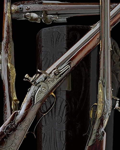 German, circa 1750, with octagonal swamped 27in. barrel, concentric circles engraved to the muzzle-flat, brass dove-tailed fore-sight bead situated within a field of rococo shells, dove-tailed standing notch rear-sight with additional folding leaf and carved and pierced tail, further rococo scroll and shells engraved to the squared solid top-tang and extending onto the breech area, curved bevel-edged lock signed within and beneath the frizzen-spring 'PERNS DORFFER, AN ANSFACH', and deeply relief carved with a scene of a stag being brought down by hunting dogs, lozenge shaped pan, re-faced frizzen carved on the front with rococo scrolls and a central grotesque mask, relief acanthus leaf carving to the hammer (top-jaw and screw probable replacements), walnut full-stock carved with borders around the barrel, ramrod channel and furniture, the majority of the remaining surface area carved in relief with loose flowing vines, iron square socket for additional peep-sight (missing) to wrist, angular raised plain cheek-piece, sliding patchbox to right hand rear of butt mounted with a rococo relief carved radiused gilded lid, border and rococo scroll engraved gilded heel-plate with relief carved rococo top-spur, en-suite trigger-guard bow with raised gilded tang, rococo relief carved and engraved gilded sideplate, turned and carved gilded ramrod thimbles and relief carved and gilded nose-cap, replacement ramrod, some wear to the gilded finish