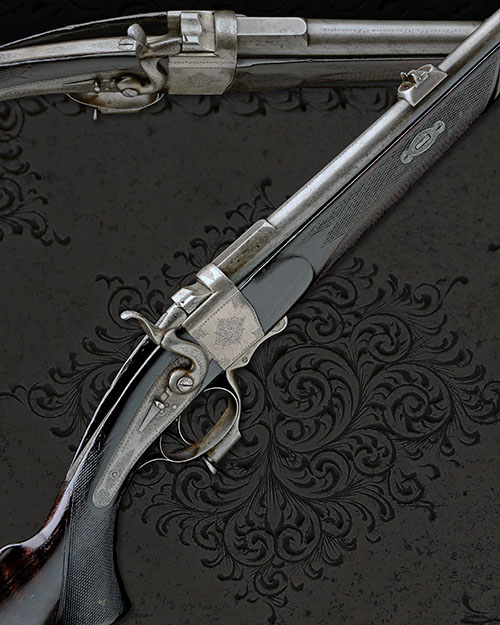 26 1/4in. round black powder only barrel engraved 'ALEXR. HENRY & CO. 18, FREDERICK ST. EDINBURGH', block-mounted open sights with two folding leaf sights, white metal sight lines and marked for 50,150 and 200 yds, block-mounted bead fore-sight, action numbered 2311, right hand bolted back-action lock, border and acanthus scroll engraving, brushed finish, 14 3/8in. figured pistolgrip stock with pistolgrip-cap and steel buttplate, missing rear sling eye, weight 5lb.