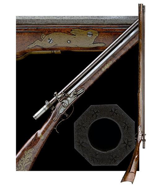 circa 1770, of 'jaeger' style and probably produced in America by early Dutch settlers, with 43 1/4in. octagonal barrel, a ring of stars stamped to the muzzle-flat, the top of muzzle engraved with a ball-band and naive vines, similar repeated at breech, the top-flat engraved with a star forwards of the rear-sight dove-tail (sight removed, missing), solid squared top-tang engraved with naive vines and a tulip, curved and radiused lock signed 'GALLARDAS' and engraved with flowing vines, plain hammer, unbridled frizzen, border-carved birds-eye maple full-stock with 'roman-nose' comb, diamond section wrist inlaid with an engraved brass squirrel, hinged border engraved brass patchbox with pierced and engraved floral hinge and surround, brass crescent heel-plate with faceted top-spur and flat toe-plate, angular raised cheek-piece inlaid with a brass engraved eagle with outstretched wings, faceted trigger-guard tang with raised, spurred finger-piece, plain trigger-blade with pierced rear web, various further inlaid brass motifs to the fore-end including a bear, a rabbit and two fish, engraved dumbell-ended take-down pin escutcheons, brass ramrod throat with bulbous mount, roll-ended ramrod thimbles and engraved muzzle-cap, possible replacement brass tipped ramrod finished to represent stripy maple, TOGETHER WITH an early iron tube-sight measuring 48in. overall, the front mount utilising the original dove-tail for the fore-sight blade (fore-sight missing), the rear mount with finger-wheel adjusters mounted on a pillar affixed to the wrist, internal post and circle element, possibly originally designed to accept various lenses now absent.
