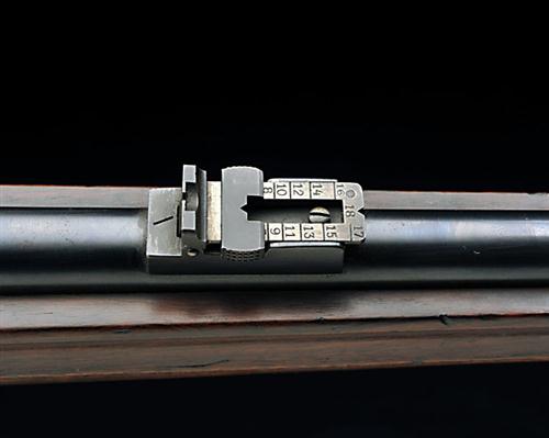17 3/4in. nitro barrel, block-mounted bead fore-sight, rear tangent sight, receiver ring engraved with a crown and 'Md. 1893', sidewall engraved 'STEYR 1908', flag safety, 3/4 length stock with sling swivels, 13 1/4in. pull, complete with its Small Arms School Corps collection identification tag