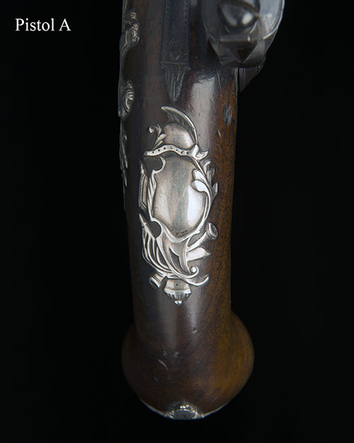 circa 1770, with turn-off iron 5in. triple-banded cannon barrels, signed 'LONDON' terminating in engraved arabesques at the breech-ends, London proofs and makers mark 'RW' together with the signature 'WILSON' to the undersides of the breech, engraved iron top-tangs, rounded boxlock actions, 'L' shaped frizzen-springs, un-hallmarked silver furniture including short-tailed butt-caps with grotesque masks, rococco escutcheons to wrists and pierced martial trophy side-plates and double roll-edged trigger-guard bows forming the safety catches