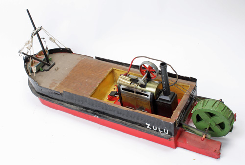 A HOME-BUILT MODEL OF A STEAM CARGO VESSEL, approx. 25in. length overall, appears to be crudely scratch-built and powered by a Mamod single-cylinder steam engine (not tested or certificated).