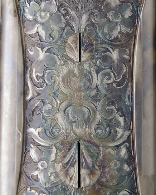 23 5/8in. nitro barrels with double gold-line details at the breech end, matt sight rib carved in high relief with rococo floral and scroll designs, open sights, chequered ramp-mounted bead fore-sight with flip-up moonsight, the breech end mounted with a Swarovski Habicht 1,5-6x42 telescopic sight in quickly-detachable mounts, bolstered treble-grip action with side-clips, manual safety, hand-detachable lockplates, cocking-indicators, set front trigger, the action, lockplates and furniture profusely engraved in high relief with bold rococo floral and scroll motifs on a finely matted background, with occasional gold line highlighting, the lockplates with central golden flower, the fore-end iron decorated en suite, 14 1/2in. figured semi-pistolgrip stock with cheekpiece, sling swivels and including 1/2in. rubber recoil pad, fore-end with bolstered wood and Deeley & Edge patent release catch, weight 9lb. 15oz., in a Blaser universal take down case