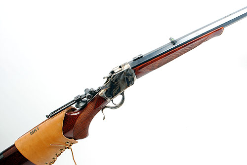 A UBERTI, ITALY .40-65 (WCF) SINGLE-SHOT MATCH-RIFLE, MODEL 'WINCHESTER 1885 HIGH-WALL', serial no. S02859, with heavy octagonal 30in. blued barrel, dove-tailed tunnel fore-sight, spirit level mounted forwards of the breech, provision for telescope mounting blocks (one present), colour-hardened plain receiver, central hammer, top-tang mounted with vernier peep-sight, walnut chequered pistol-grip butt-stock, crescent iron heel-plate, colour-hardened under-lever, chequered walnut splinter fore-end with moulded tip, the whole appearing little used; COMPLETE WITH a leather padded lace-on cheek-piece