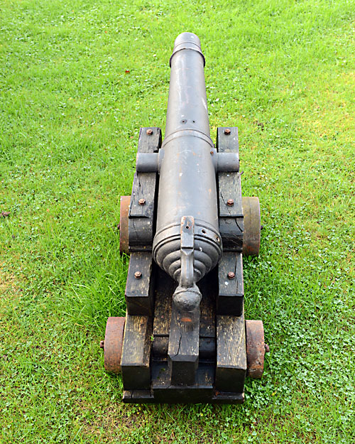 English, first quarter of the 19th century, with tapering 43in. barrel (spiked), moulded bands, the central section with two holes drilled for sights, the breech ring with three, reduced diameter trunnions, dolphin at cascabel an expert replacement; TOGETHER WITH a wood trolley with spoked iron wheels to the fore and iron-banded wooden wheels to the rear