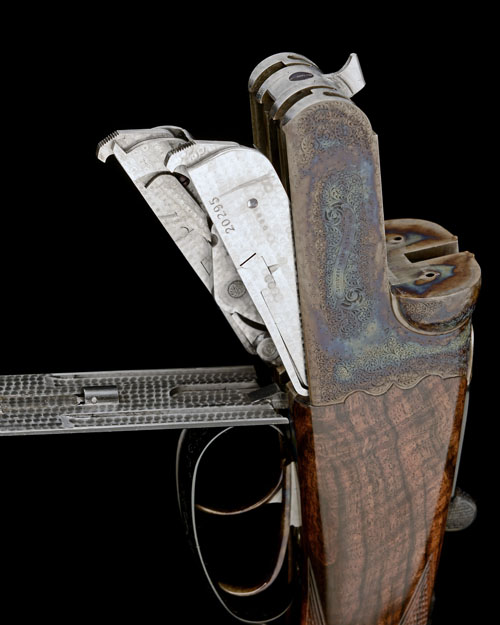 29in. 2012 superior proof nitro chopperlump barrels with beaded line and scroll detailing at the breech end, rib engraved 'WESTLEY RICHARDS & CO. LTD. ENGLAND', 2 3/4in. chambers, Teague multichokes (with spares), scroll-back treble-grip action with model C dolls head, Westley Richards patent toplever, automatic safety with gold-inlaid 'SAFE' detail, hinged floorplate, John Deeley and H.B. Taylor 1897 patent detachable locks with scroll engraving and engine turned finish, rolled-edge triggerguard, profusely engraved with very fine acanthus scrollwork, the makers name inscribed in fine bold acanthus scrolling banners on a matt background, retaining virtually full original colour-hardening and finish, the triggerguard tang gold-inlaid with the serial number, 14 7/8in. highly-figured stock, fore-end with Deeley & Edge patent release catch and horn finial, the fore-end iron screws with fine beaded border and acanthus scroll detailing, weight 5lb. 10oz.