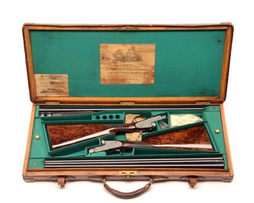 28in. nitro barrels, ribs gold-inlaid '1' and '2' at the breech ends and engraved 'BOSS & CO. 73. ST. JAMES'S STREET. LONDON.', 2 1/2in. chambers, bored approx. imp. cyl. and 1/4 choke, wall thicknesses below recommended minimum, some rivelling, toplevers gold-inlaid '1' and '2', manual safeties with gold-inlaid 'SAFE' details, gold-inlaid cocking-indicators, non-selective single triggers, rolled-edge triggerguards, best fine floral bouquet and acanthus scroll engraving, the triggerplates with Boss 1894 patent single trigger details, brushed bright and reblued finish overall, 14 3/4in. highly-figured replacement stocks, weight 6lb. 7oz., in their re-lined brass-cornered oak and leather case