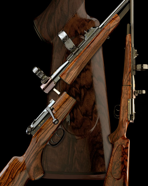 25 3/4in. fluted nitro barrel, barrel sight shroud finely engraved with floral and acanthus scroll designs, chequered open sights with gold-inlaid sight line and folding leaf sight, ramp-mounted bead fore-sight similarly embellished, the breech end gold-inlaid with the makers logo and calibre designation and mounted with fine floral and scroll-engraved telescopic sight rings in quickly-detachable mounts, bolt housing gold-inlaid with the Mauser details, model designation and 'DBP 1 205 423', quick-release take-down mechanism, set triggers, highly-figured pistolgrip stock with cheekpiece, sling eyes, steel pistolgrip-cap (with trap), horn finial, 14 7/8in. pull including 5/8in. rubber recoil pad