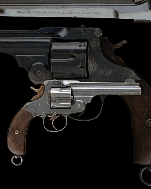 circa 1917, with 5in. blued barrel, raised sighting rib signed 'FA DE TROCAOLA ARANZABAL Y CIA EIBAR (ESPANA)', applied crescent fore-sight, rear-sight notch to the barrel-latch, blued fluted cylinder, break-open frame with automatic ejection, colour hardened trigger and hammer, chequered walnut two-piece grips, the back-strap marked '605' and '2N' over '61', the heel stamped '1S' over '24' (crossed out) and fitted with a lanyard ring, the whole retaining much probable original faded finish