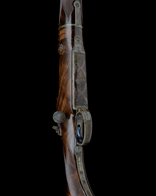 23 1/2in. nitro barrel gold-inlaid 'MANUFACTUR T. JUNG. LOHMAR', and with twin gold band details at the breech end, finely matted sight rib with gold line bordering and gold-inlaid with the calibre designation, open sights and two folding leaf sights, finely file cut finish with gold-inlaid sight lines and marked for 50, 100 and 200 yards, finely matted ramp-mounted gold bead fore-sight with gold line detailing and fold-over moonsight / protector, interrupted thread take-down system, double square-bridge action with breech thread protecting plug, quickly-detachable telescopic sight mount bases with chequered tops and gold line bordering, elongated top strap, colour-hardened bolt with progressive radial cut chequering and gold highlighting, engraved and colour-hardened recoil blocks with gold line border, hinged straddle floorplate with push button release, best acanthus scroll engraving overall, very highly-figured pistolgrip stock with cheekpiece, colour-hardened and engraved steel pistolgrip-cap and sling swivels, 15in. pull including 1/2in. rubber recoil pad, in its fitted alloy take down rifle case with gold-tooled Theo Jung trade label