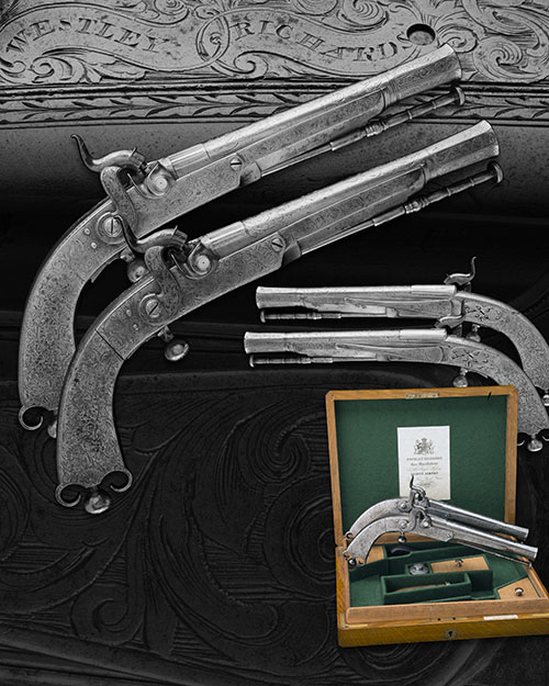 circa 1880, with triple staged 7in. barrels, the muzzles scroll engraved and faceted for the last 1 1/2in., moulded bands at the intersection, the breeches with longitudinal flutes, the centre sections scroll engraved, carved snails with platinum vents, fully scroll engraved locks signed 'WESTLEY RICHARDS' within a flowing banner, border and scroll engraved 'ramshorn' shaped butts with screw-retained prickers in the heel, ball triggers and scroll engraved fore-ends, scroll engraved belt-hooks with pierced and engraved feet and turned pan-headed ramrods (some mild staining and cleaning); TOGETHER WITH a later oak storage case, compartmented and lined in green baize and containing a modern flask and other accessories and an antique scissors ball-mould, the case lid with reproduction parchment trade label