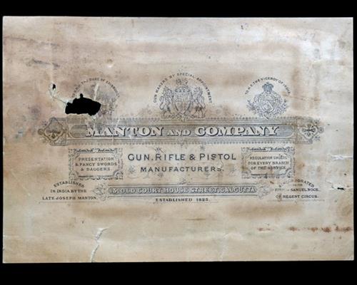 28in. nitro barrels with matt sight rib, open sights and leaf sights for 100, 200 and 300 yards, ramp-mounted bead sight, tubes engraved 'MANTON & CO. GUNMAKERS. LONDON & CALCUTTA. BY APPOINTMENT TO H.E. THE VICEROY', and 'AMMUNITION - .470 - 3 1/4IN - SOLID METAL CASE. 75-GRS -CORDITE. 500 GRS - BULLET.', treble-grip action with removable striker discs, automatic safety with gold-inlaid 'SAFE' detail, border and scroll engraving, retaining some original colour-hardening, 14 3/4in. highly-figured replacement pistolgrip stock with cheekpiece, sling swivels, steel pistolgrip-cap and including 7/8in. rubber recoil pad, matching replacement bolstered fore-end wood, weight 10lb. 14oz., in its re-lined brass-cornered oak-lined canvas case with original trade label