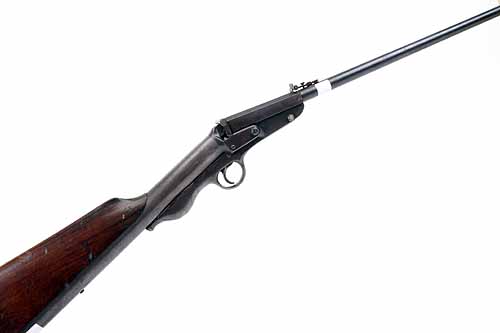 A BONEHILL, BIRMINGHAM .177 BARREL-COCKING SINGLE-SHOT AIR-RIFLE, MODEL 'BRITANNIA 'ANGLO SURE-SHOT MK I'', serial no. 1457, circa 1907, with two stage 20 1/2in. barrel, dove-tailed front and adjustable rear-sights, the top-flat signed 'ANGLO SURE-SHOT MARK 1, MADE ONLY FOR R. RAMSBOTTOM, MANCHESTER' and 'COX'S PATENT', the side of breech stamped 'THE BRITANNIA' surrounding a seated figure of Britannia bisecting the legend 'REGD TRADE MARK', stirrup barrel locking latch, slanted air-chamber with applied walnut comb, cocking link housing the trigger-unit stamped 'RD394207', the whole darkly stained with traces of finish