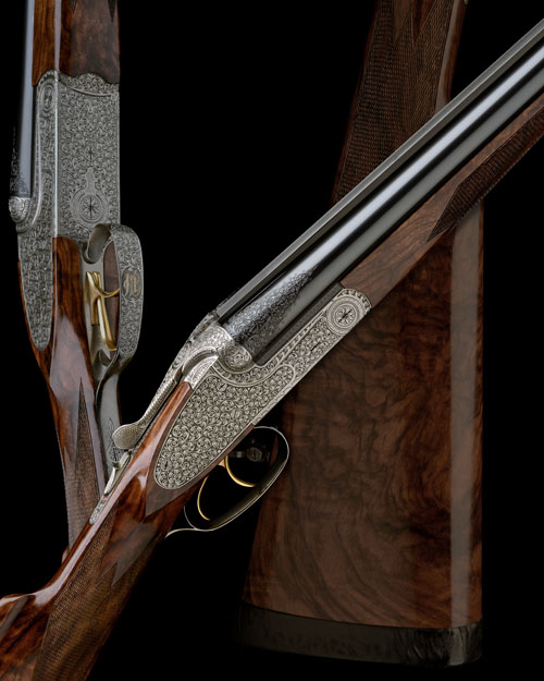 treble-grip action with side-clips and side-bolsters, manual safety, cocking-indicators, gold-washed triggers, profusely engraved with fine Germanic scrollwork and with beaded bordering, bright finish, the triggerguard gold-inlaid with a monogram 'HB', 14 1/4in. highly-figured stock with sling swivels and including 3/4in. leather covered recoil pad, weight 6lb. 7oz., in a case with provision for both sets of barrels