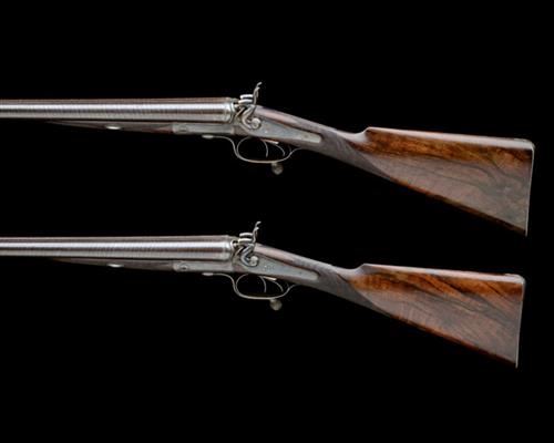 30in. black powder only bold damascus barrels, ribs engraved 'BOSS & CO. 73 ST. JAMES'S STREET. LONDON.', and '1' and '2', 2 1/2in. chambers, bored approx. true cyl. in all, Jones patent rotary underlevers, carved percussion fences, rebounding back-action locks, border engraving, retaining some original colour-hardening, 13 3/4in. well-figured stocks including steel buttplates, weight 6lb. 14oz., in their leather two-tiered case, the lid outer marked 'C.J. PHILLIPS. ESQ.'