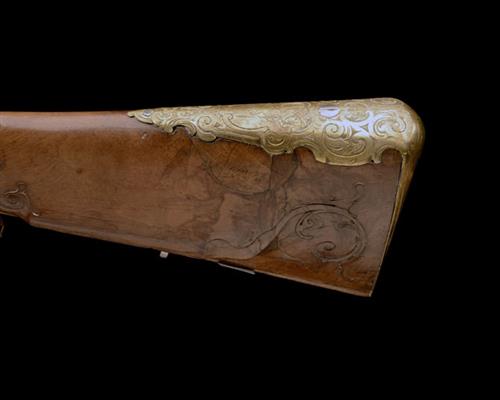 Austrian, circa 1800, with 39 3/4in. two-stage sighted barrel etched with a damascus twist pattern and struck at the breech with maker's marks, flat bevelled lock signed 'AUGUSTIN SCHOFL IN WEIN' and engraved with scrollwork and a vignette of a mounted huntsman with a hound and a flight of ducks, walnut half-stock with raised cheek-piece, engraved gilded brass mounts, wooden trigger-guard and later wooden ramrod.