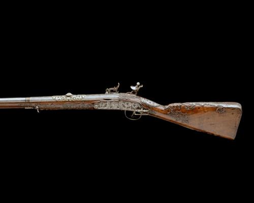 North Italian circa 1710, with 31in. two-stage barrel signed on the fluted breech-section 'LAZA INO COMINAZO' (sic), applied silver fore and rear-sights each pierced and engraved with scrollwork, scroll engraved flat bevelled lock (top-jaw and screw replaced), figured walnut full stock carved in relief with scrollwork (fore-end cracked and with old repairs), foliate engraved iron mounts including pierced side-plate, sling mounts and later ramrod (cleaned bright overall).