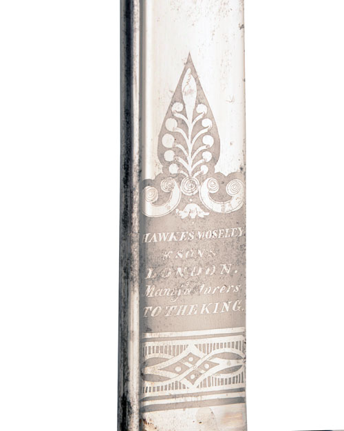 circa 1825, with broad pipe-backed polished 35 1/2in. quill-point blade (minor spots of discolouring) and false edged for the last 9 3/4in., small etched rectangular panel approximately one third of the way along the blade on both sides featuring a William IV crest with floral motifs, the forte on the right hand side etched with 'HAWKES MOSELEY & SONS LONDON, MANUFACTURERS TO THE KING' together with a decorative band below and an arabesque above, iron three-bar half-basket hilt with turned down quillion, wire-bound sharkskin hilt with pronounced pommel and steel scabbard with twin loose suspension rings, the exposed iron surfaces covered with a varnish-type preservative