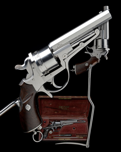 circa 1870, with octagonal 4 3/4in. barrel, dove-tailed fore-sight, standing notch rear-sight on the recoil shield, plain open frame, plain stepped cylinder, smooth walnut grips with lanyard ring at heel, the backstrap with escutcheoned aperture for a folding wire butt-stock attached via a nut at the pommel, the action opening mechanism located beneath the barrel with the hinged lever forming the trigger-guard, the whole in near unblemished 'in the white' finish as supplied, Liege proofs and appearing little used; TOGETHER WITH its maker's embossed chequered leather covered storage case with rounded corners and further embossed tram-lines to the lid, the closure flange affixed with small dome-headed brass tacks, the interior compartmented and lined in dark red velvet in the Continental fashion, the padded inner lid with gilded blocked letters reading 'GALAND, FABRICANT D'ARMES, PARIS, 3. RUE RICHER .3' (tarnished), the tray containing the pistol with the shoulder-stock attached but folded, a cleaning rod, wire brush, jag and loop end, oil-bottle and turn-screw, together with two lidded compartments with florally embossed edges, the front with brass lock and key