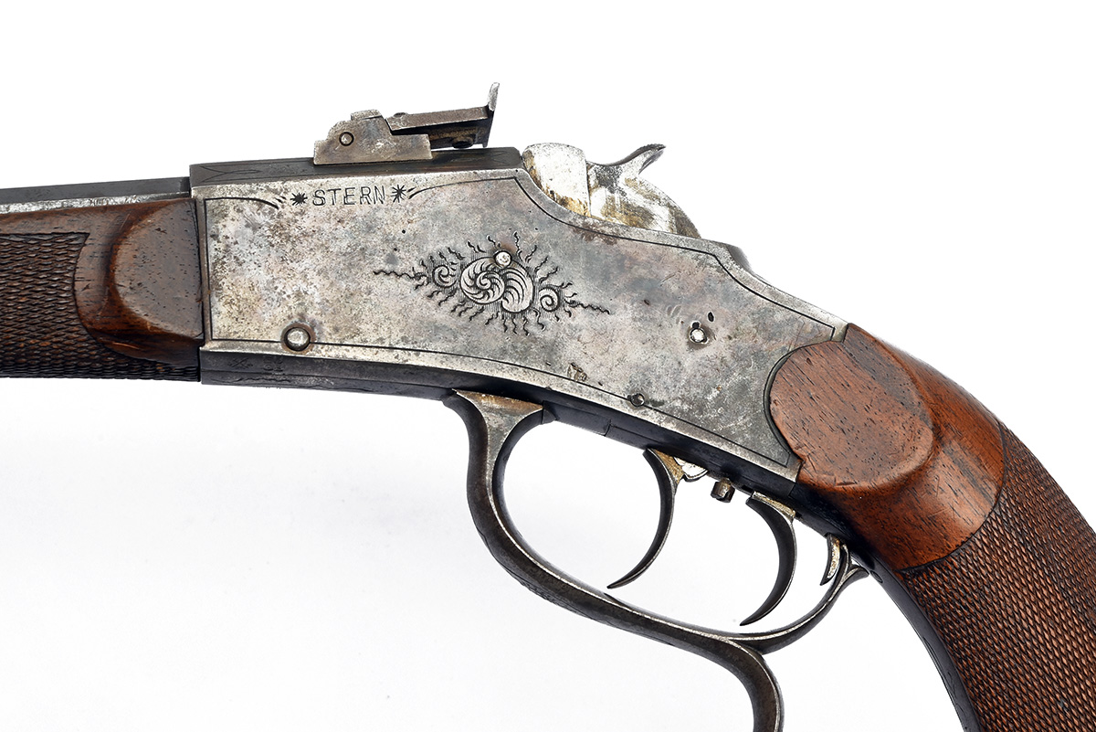 A DEACTIVATED 'STERN' .22 FALLING BLOCK TARGET PISTOL, serial no. 527, circa 1900, 11 3/4in. blued octagonal barrel, ramped bead fore-sight with side protectors, adjustable open rear sight, falling block action, the triggerguard acting as the opening lever, double-set triggers, the left side engraved '*STERN*', border and scroll engraving, retaining traces of colour-hardening and finish, chequered bag grip and splinter fore-end, together with its 2025 EU deactivation certificate