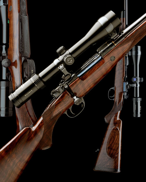 24 7/8in. nitro barrel gold-inlaid 'HARTMANN & WEISS . HAMBURG', block mounted open sights and matted ramp-mounted bead fore-sight with flip-up moonsight, the receiver (with thumb cutout) mounted with a Zeiss Varipoint 2,5-10x42 T* Victory telescopic sight in quickly-detachable mounts, the receiver ring with finely matted art deco panel and gold-inlaid with the calibre designation, fine acanthus scroll engraving and retaining virtually full blacked finish, engraved recoil blocks, triggerguard and trigger, hinged floorplate with push button release, the housing signed 'H.F.', highly-figured pistolgrip stock with cheekpiece, engraved steel pistolgrip-cap, sling swivels, 14 1/4in. pull including 3/4in. leather covered recoil pad