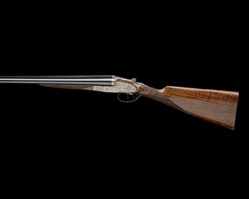 27 5/8in. (70cm) nitro barrels with raised matt rib, tubes engraved 'FAURE LE PAGE. A PARIS.', 2 3/4in. chambers, bored approx. 1/4 and 3/4 choke, treble-grip action with hidden third bite, removable striker discs, manual safety with gold-inlaid 'S' detail, blued triggers with articulated front trigger, best fine bouquet and scroll engraving, the triggerplate signed 'T. Thys', bright finish with blued lockpins, 14 3/4in. highly-figured stock, fore-end finely inlet in silver with a musketeer, weight 6lb. 9oz.