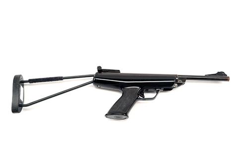 A .177 BREAK-BARREL AIR-PISTOL SIGNED BSA, MODEL 'SCORPION', serial no. PA39654, WITH SHOULDER-STOCK, early model, with 8in. barrel, ramp fore-sight, adjustable rear-sight fitted at end of air-chamber, no telescopic sight rails, black plastic receiver and integral chequered grip, missing safety catch and cocking-aid; TOGETHER WITH an amateur integral wire skeleton stock, competently produced