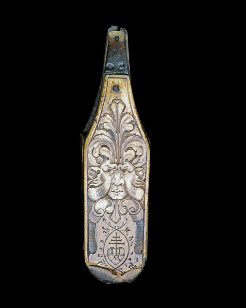 central European circa 1590 and almost certainly converted from matchlock or wheel-lock, with 47 1/2in. two-stage iron barrel with multiple moulded bands at the intersection, bulbous muzzle with bead fore-sight, armourer's stamp at breech, incomplete rusted snaphaunce lock (missing hammer and possible other internal parts) fitted over an inlet wooden filler, walnut semi fish-tailed lozenge-shaped full-stock profusely covered with inlet engraved bone panels, many featuring figures in tudor dress, the voids between with inlet bone borderlines and floral scrolls (losses, damage), the heel-plate featuring the mask of a green man over a heart bearing the initials 'I.L.' over 'M', long iron trigger-guard bow with raised finger-tang, provision for under-barrel ramrod (missing), iron surfaces with corrosion, small losses to sharp edges of wood