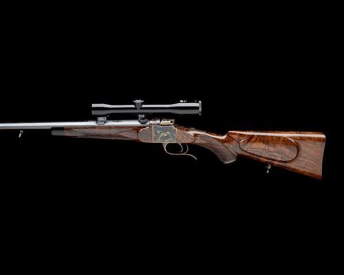 23 1/2in. nitro octagonal barrel, integral sight rib with folding leaf sight with matt finish, white metal inlaid sight line and marked for 100 yards, ramp-mounted bead fore-sight, rib gold-inlaid 'M. HAGN' and with the calibre designation, the breech end mounted with a Hensoldt Diatal-D 4x32 telescopic sight in quickly-detachable mounts, tang-mounted roller safety, finely matted trigger, the action finely engraved with acanthus scrollwork and inlaid in three-colour gold with floral designs and gold line bordering, with central flowing banners gold-inlaid 'SYSTEM HAGN' and 'BC CANADA', the triggerguard tang gold-inlaid with the serial number, bolstered fore-end wood with horn finial, 14 1/8in. highly-figured pistolgrip stock with cheekpiece, engraved and colour-hardened steel pistolgrip-cap, sling swivels and finely chequered and colour-hardened steel buttplate, weight 7lb. 7oz., in a full length brass-cornered canvas and leather case
