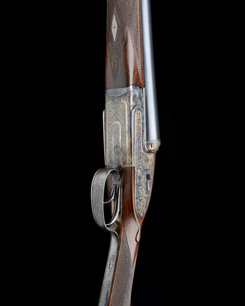 28in. nitro chopperlump barrels, 2 3/4in. chambers, bored approx. imp. cyl. and 1/2 choke, engraved arcaded fences, removable striker discs, automatic safety, hand-detachable lockplates, gold-inlaid cocking-indicators, articulated front trigger, rolled-edge triggerguard, acanthus scroll engraving, retaining much original colour-hardening and traces of finish, 14 1/4in. stock, weight 6lb. 9oz., in a Gunmark leather case