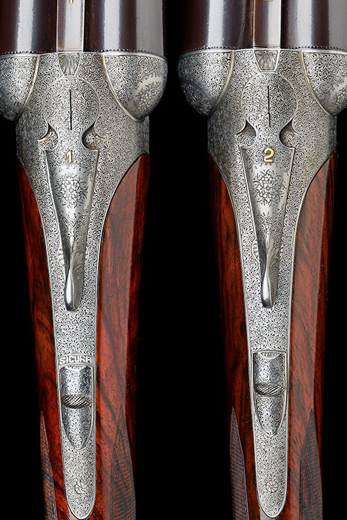 27 3/4in. nitro chopperlump barrels, the ribs gold-inlaid '1' and '2', the the left tubes engraved 'ABBIATICO & SALVINELLI. "FATTO PER ENRICO ARIENTI", 2 3/4in. chambers, bored approx. imp. cyl. and 1/2 choke (both), Holland & Holland style self-opening actions, the toplevers gold-inlaid '1' and '2', manual safeties with engraved 'SICURA' detail, rolled-edge triggerguards, articulated front triggers, finely engraved with bouquet and acanthus scrollwork, the undersides engraved with the model designation within a banner, the triggerguards gold-inlaid with 'AE' intertwined, the fore-end woods gold-inlaid with the makers crest, 14 1/4in. figured stocks including 3/4in. leather-covered rubber recoil pads, weight 6lb. 1oz. (both), in their makers tartan-lined brass-cornered oak and leather double guncase with green canvas and leather outer
