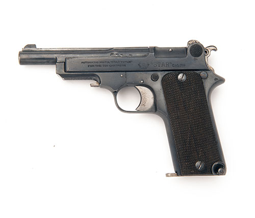circa 1919, with exposed blued 4 1/2in. barrel, sighting rib with blade fore-sight, open slide with cocking piece to rear and incorporating the notch rear-sight, the left side of slide marked variously 'AUTOMATIC PISTOL "STAR" PATENT FOR THE 7.65MM CARTRIDGE', and 'STAR' with a starburst trademark and ''CAL 7.65', exposed hammer, blued frame and chequered walnut grips, complete with its double oil-bottle