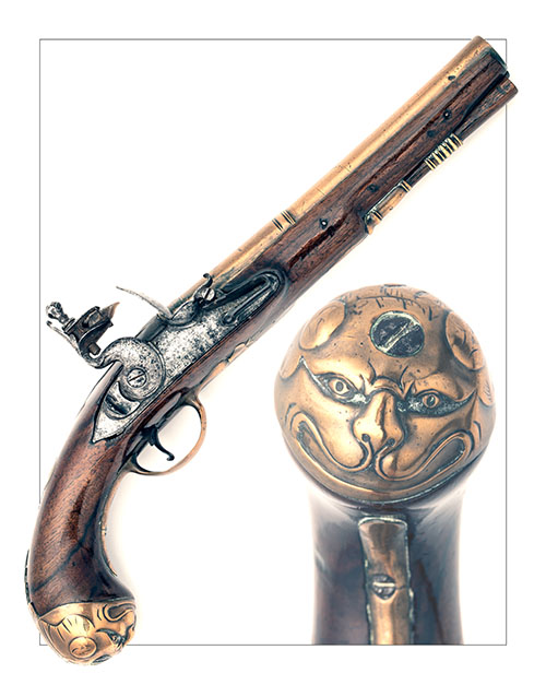 the round two-stage 7 3/4in. swamped barrel circa 1710, moulded bands at the intersection and breech, double struck makers mark and signed 'I. AUSTIN', solid iron top-tang, radiused borderline engraved slightly curved period lock signed 'BLYTH (E?)' (lightly pitted), large sliding safe behind the hammer, bridle-less frizzen, possibly later walnut full-stock with brass furniture including grotesque lion-mask butt-cap with rear tail-spur, rococo escutcheon at wrist, pierced floral side-plate and turned ramrod pipes, original worm-ended ramrod