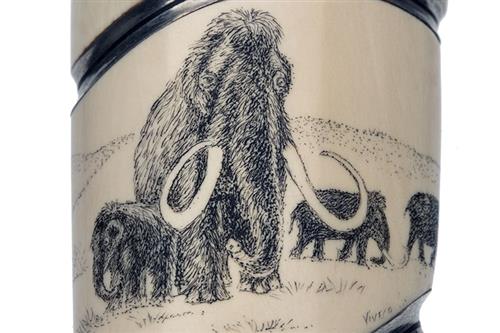 with a 3 1/2in. mosaic damascus blade by Mattias Styrefors, the traditionally shaped hilt formed in three segments separated by polished white metal bands, the front and back pieces of fossilised whale-tooth finely engraved by Jonny Walker Nilsson, the centre section of fossilised mammoth-tusk and scrimshawed with depictions of woolly mammoths by Viveca Sahlin, the pommel with small white-metal stud and an inset gemstone to the right hand side, complete with its moulded leather scabbard signed 'Stenevad' and suspension loop fixed with a carved mosaic damascus stud, unused
